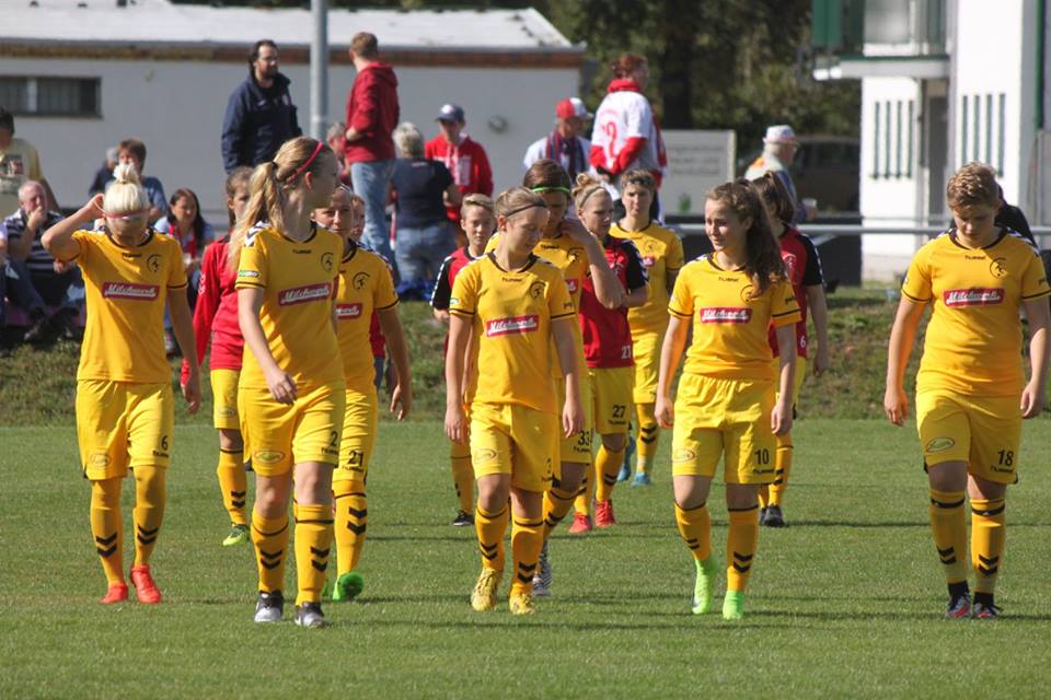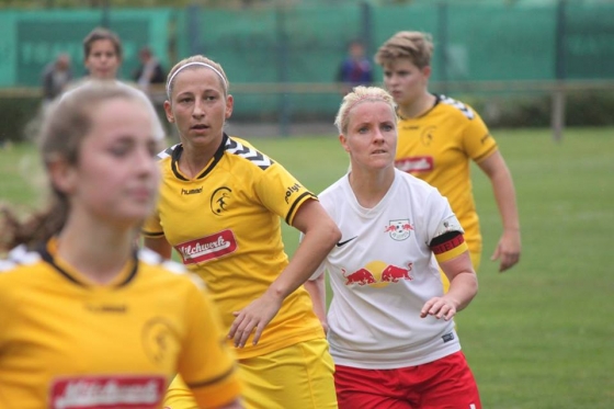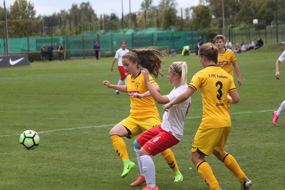 Früh versuchten die Leipzigerinnen mit ihrer starken Offensive das Spiel zu entscheiden. Die erste Chance hatte Madlen Frank mit einem Lattenaufsetzter - Glück gehabt. Besser machte es Sophie Görner, denn ihr Distanzschuss schlug im Kasten zum 1:0 ein. Zu diesem Zeitpunkt waren erst sieben Minuten gespielt, doch Dresden antwortete kurz darauf. Julia Eisold schob den Ball nur knapp am Leipziger Tor vorbei. Es entwickelte sich ein munteres und unterhaltsames Spiel. Wieder konterte RB, doch durch Sophie Görners Lupfer ging über das Tor. Fortuna hatte mit Neuzugang Yvonne Starick ebenfalls eine gute Chance, aber der Schuss ging leider drüber. Danach wieder RB mit Chiara Teresa Graf, die frei durch war, aber sie scheiterte im 1gegen1 an Svantje Hagemann. Danach Julia Eisold mit der Flanke in die Mitte, doch Juliane Jonas verpasst nur knapp. Wenige Minuten vor der Pause ging es dann schnell in unserem Strafraum zu. Sophie Görner passte auf Shanga Forsberg und es stand 0:2. RB hatte Sekunden vor der Pause noch die Möglichkeit zum dritten Treffer, aber diese Situation wurde wegen Foulspiels an unserer Torhüterin zurückgepfiffen.