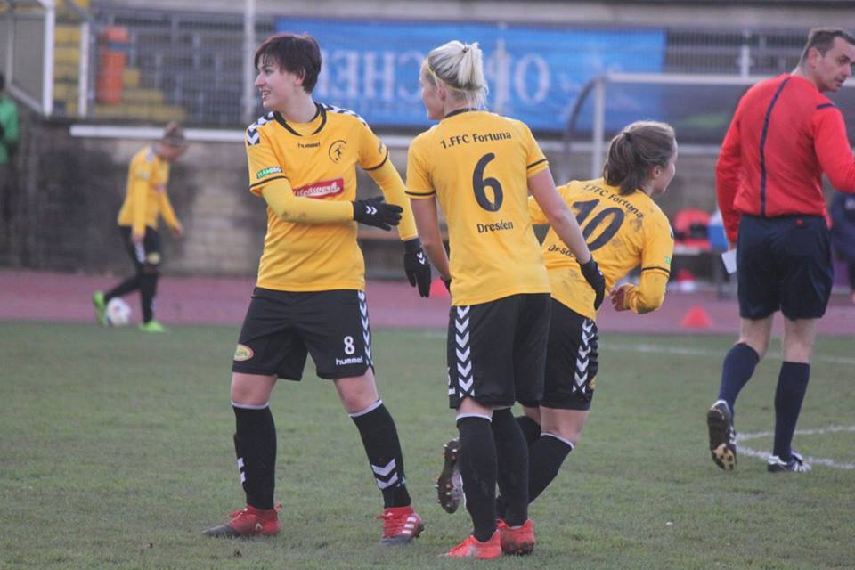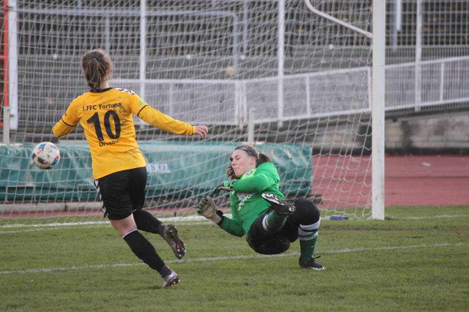 Zum dritten Mal in Folge stehen unsere Fortunen im Endspiel um den Sachsenpokal. Nach einem, in der Höhe nicht unbedingt zu erwarteten 5:0 Sieg gegen den Dauerrivalen aus Aue, konnten die Mädels von Trainer Andreas Pach am Ende jubeln. Zuvor führte aber Anna Eifler die Gäste im Sturm vor unser Tor. Doch bereits im Gegenzug folgte der erste Streich. Carolin-Sophie Härling wird im Strafraum von Elisa Polusik gefoult und Carolin Kieper verwandelt den Strafstoß sicher. Die Gäste zeigten sich nicht geschockt und machten mit Tempo weiter. Die Auerinnen kamen durch Kathleen Buchmann fast zum Ausgleich. Nach einem Eckball fiel dann aber schon das 2:0. Yvonne Staricks geblockter Schuss wird von Carolin-Sophie Härling, die schön nachsetzt, ins Eck verlängert. Aber auch nach dem zweiten Treffer war Aue immer wieder gefährlich. Nach einer Ecke strich der Ball haarscharf über die Latte.