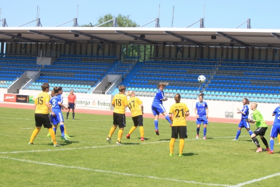 Auf der anderen Seite blockt Nicole Zesewitz einen Schuss, anschließend haben die Fortuninas Glück, da die Gäste einmal drüber und einmal vorbei schießen. Tessa Glöckner zeigte mehrfach ihre Schnelligkeit, aber auch sie fand in Cecilia Kuntz ihre Meisterin. Dann glückte Aleksandra Flegel die Führung der Gäste, nachdem sie allein auf das Tor zulaufen konnte. Danach konnten sich die Hausherrinnen etwas befreien, ohne aber gefährlich zu werden. In der Nachspielzeit der ersten Halbzeit bauten die Berlinerinnen durch Georgina Weinholz mit einem satten Fernschuss die Führung aus.