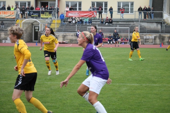 Nach der Pause ging das Spiel nach vorn gut weiter, Aue gewann aber dennoch an Spielanteilen, was unsere Mannschaft zu Unsicherheiten im Umkehrspiel brachte. Erneut waren es Anna Eifler und Nelly J. Estel, die immer wieder gefährlich vor unser Tor kamen. Noch konnten wir gut klären und nach der Umstellung in der Mannschaft gelang es auch nochmal mehr Druck nach vorn auszuüben. Beide Läuferinnen, Jenny Cordon und Tessa Glöckner, setzten sich mehrmals gegen die Auerinnen gut durch, aber ihre Eingaben in die Mitte wurden nicht verwertet. Auch nach Eckbällen und Standards blieben die gefährlichen und zwingenden Tormöglichkeiten Mangelware. Die Zuschauer merkten aber den Druck nach vorn und den Willen der Fortunen die drei Punkte unbedingt holen zu wollen.