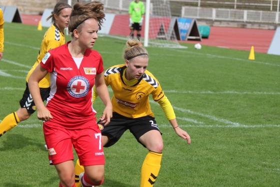 Das gleiche Duo war auch nach der Pause in Aktion. Die Ecke durch Marion Sattler landete auf dem Kopf von Carolin-Sophie Härling, die den Ball leider über die Latte köpfte. Auch Union ließ sich nicht lumpen. Maria Pia Zander Zeidam zwingt Svantje Hagemann zu einer Glanzparade. Auch im Anschluss waren die Berlinerin zweimal gefährlich vor unserem Tor. Was ihr Minuten zuvor noch nicht gelungen war machte sie jetzt besser. In der ersten Szene ist Maria Pia Zander Zeidam einen Ticken schneller am Ball als die aus dem Tor eilende Svantje Hagemann und erzielt aus dem nichts die Gästeführung. Zehn Minuten später verwandelt sie eine Hereingabe von Katharina Boedeker. Union schien sich mit der Führung zu begnügen. So brachen die letzten zehn Minuten an. Fortuna hatte nichts mehr zu verlieren und wurde offensiver. Livia Jelen passte auf Lisa Richter, die weiter auf Marion Sattler leitete und aus zwanzig Metern einfach draufhielt. Sarah Hornschuch war aber auf dem Posten und kratzte das Leder aus der linken Ecke. Die zuvor eingewechselte Lisa Sprint mit dem erneuten Zuspiel auf unsere Nummer 7, aber auch diesmal ist ihr das Glück nicht holt. Erst in der Nachspielzeit konnte Carolin-Sophie Härling verkürzen, als sie einen gefühlvollen Heber von Livia Jelen nutzte. Alles in allem wäre eine Punkteteilung drin gewesen, aber angesichts der Personalsituation konnte man mit dem Ergebnis zufrieden sein. Die kämpferische Leistung ist zu würdigen und darüber muss die gesamte Mannschaft ins Spiel finden. Kommende Woche reist die Elf von Andreas Pach nach Magdeburg, die heute mit einem 6:0 gegen RB Leipzig sehr gut in die neue Saison starteten.